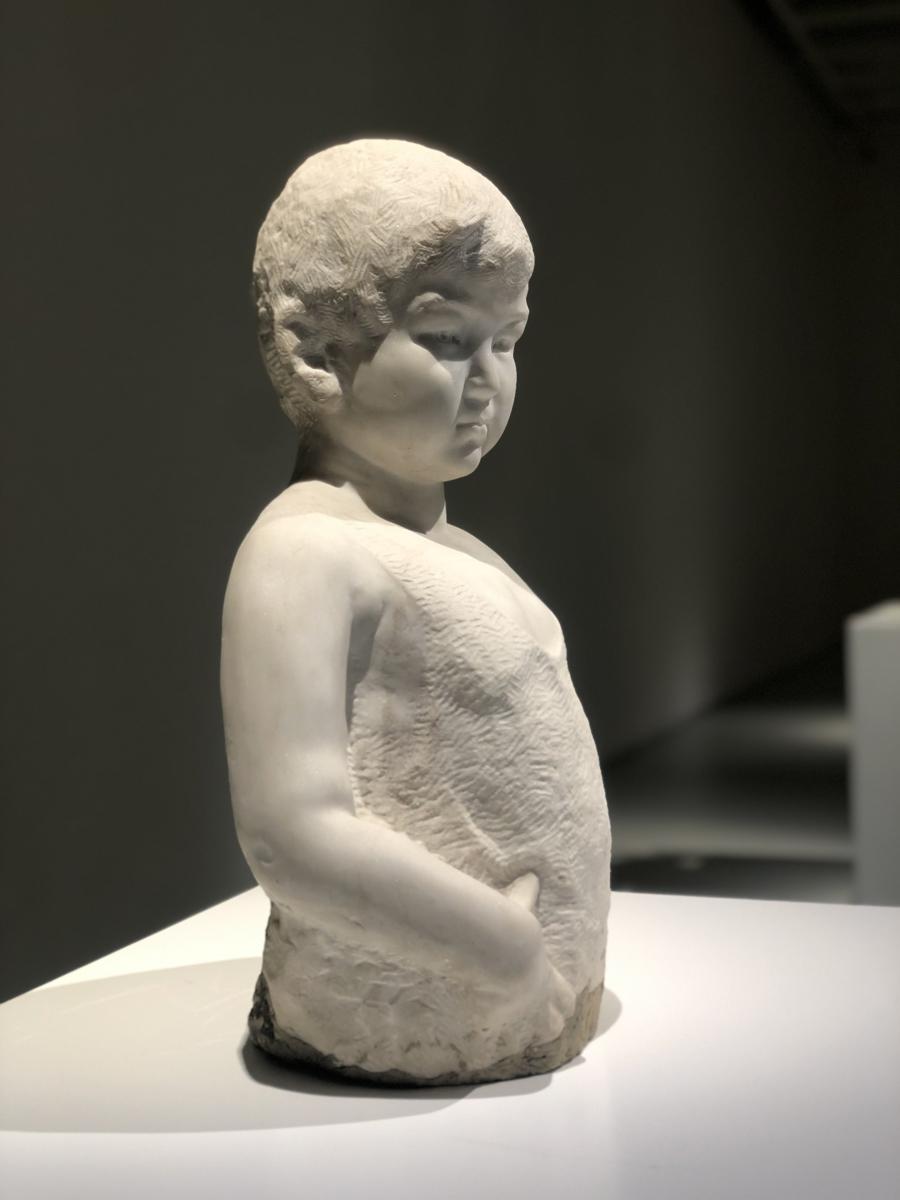 一批來自老一代藝術家的特邀作品充分顯示上海雕塑的底蘊。聚焦兒童形象的《這一代》,溫潤典雅,是唐銳鶴的作品,用大理石進行雕琢,做的是減法,從人物眼神、姿態到穿着的小背心,無不見出老一代藝術家精到的雕琢技藝,只見其肌膚的處理是光滑的,背心、頭髮的處理則是毛躁的。唐世儲的《小憩,愛因斯坦》,用的是銅塑的方式,人物的眼神、手裏拿着的菸斗,甚至毛衣背心裏邊襯衣的領子,均表現得恰如其分,讓人從中感受到愛因斯坦的神采。