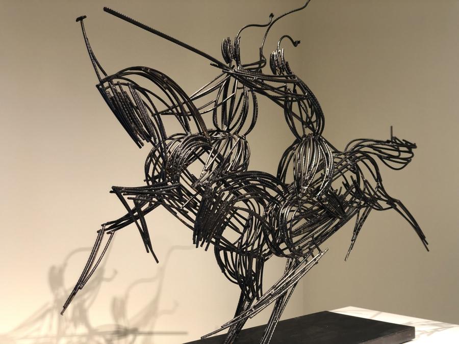 材料、工藝的多樣化,就是其中之一。“除了以往常規的泥塑,還出現了木製、各種金屬、陶瓷等越來越豐富的雕塑材料。”陳屹說。例如,乍一看有些像仙人掌的李星醒《占卜》,就是一件綜合了玻璃鋼和木頭材質而創作的。李昊澤表現草原牧民騎馬進行套圈比試的《風從草原來》,將鋼筋變化成一根根類似素描的線條,一反雕塑表達的固有方式。梁國興的《拂曉》,力圖用金屬材質表現出一種類似編織的視覺效果。郭海鵬的《滬上工程》以閃閃發光的電鍍材料再現工地場景,呈現出賽博朋克般的當代觀感。