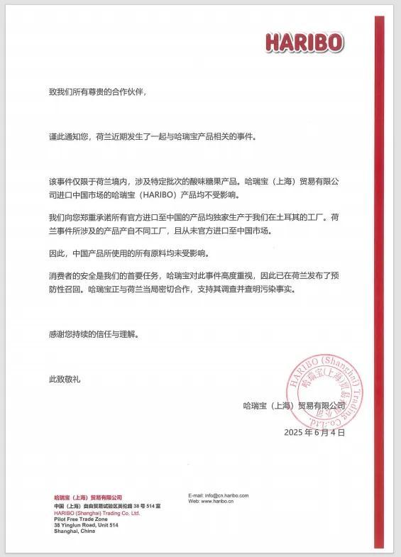 哈瑞寶荷蘭辦事處發言人表示,此次召回屬於預防性措施,公司正在全力配合調查,並強調目前的問題似乎限於“報告數量有限、區域明確的特定批次產品”。目前,荷蘭食品與藥品管理局正在追蹤產品來源及潛在污染渠道,警方尚未公佈是否涉及蓄意行爲或人爲犯罪。哈瑞寶是德國知名糖果企業,該企業擁有同名糖果品牌。