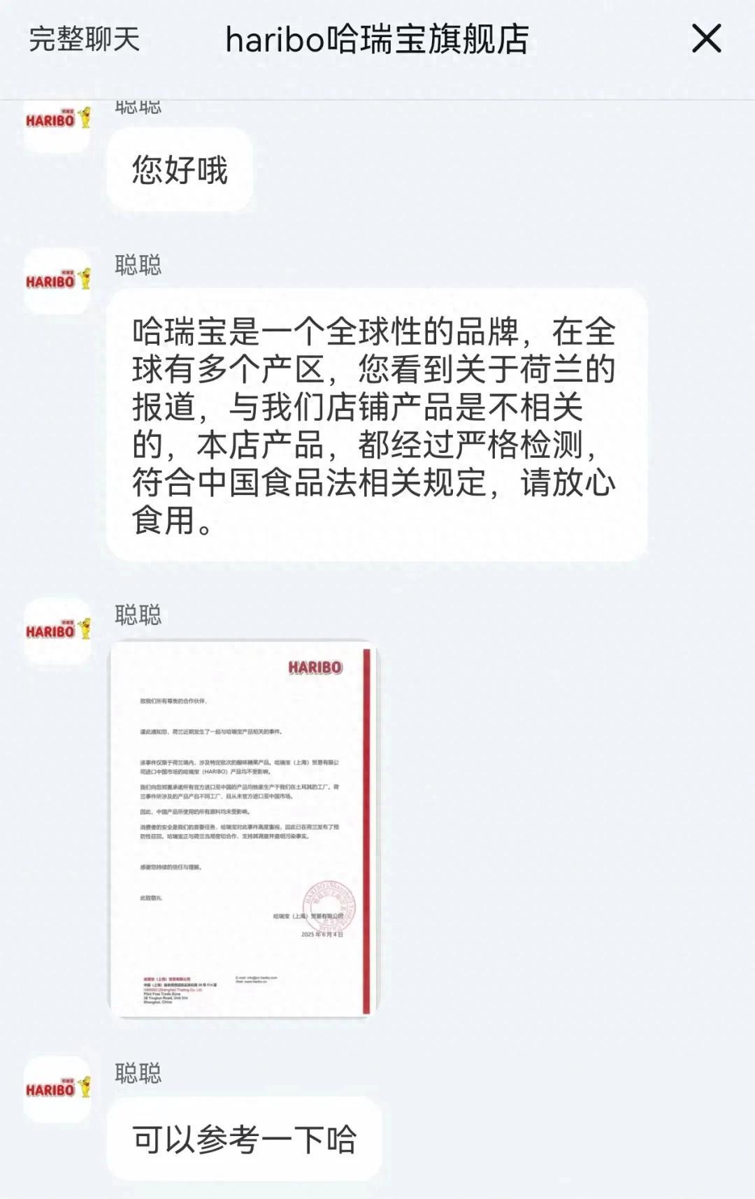 6月5日傍晚,記者以消費者身份諮詢淘寶哈瑞寶旗艦店,其網店客服回覆稱,“哈瑞寶是一個全球性的品牌,在全球有多個產區,您看到關於荷蘭的報道,與我們店鋪產品是不相關的。”