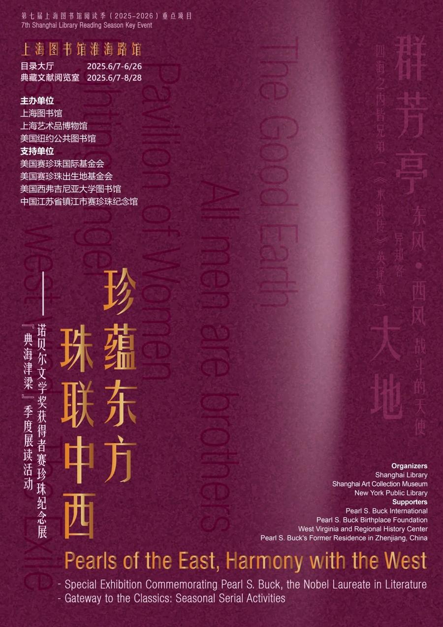 ▷“珍蘊東方,珠聯中西——諾貝爾文學獎獲得者賽珍珠紀念展”於上海圖書館開展。95年前,賽珍珠女士在中國這片土地上,以一部《東風·西風》叩響了東西方文明對話的大門。賽珍珠,這位用一生書寫中國、用行動溝通世界的傑出作家,在中西文化交流史上留下了濃墨重彩的一筆。本次展覽結合賽珍珠的人生軌跡,通過手稿、信件、影像、專題紀錄片與實物展品,講述她與中國一生不解的情緣與那份始終堅守的跨文化信念。