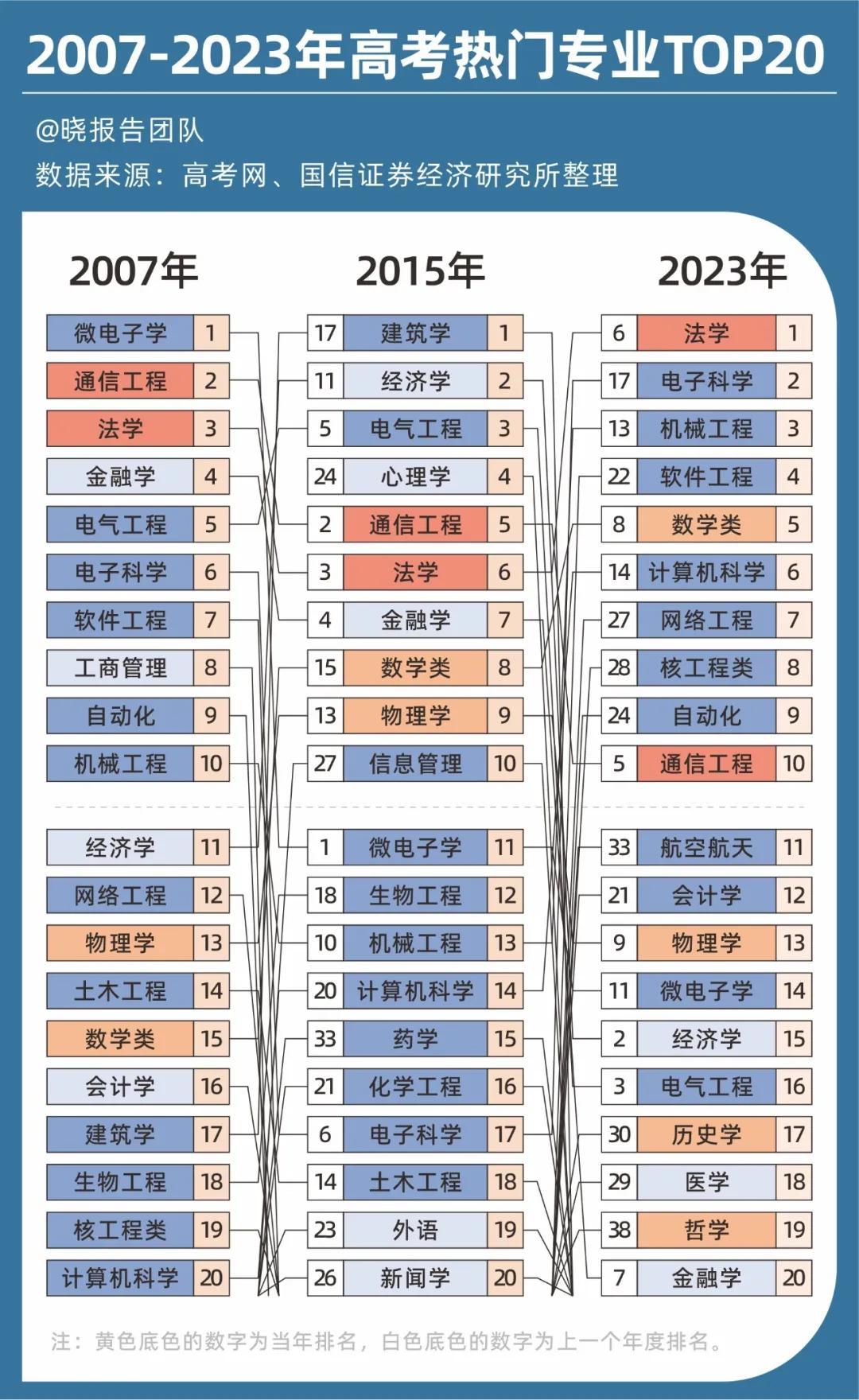 最後,回到開篇的熱門專業TOP20榜單,要說熱門專業的“常勝將軍”,單從專業本身來看,當數法學和通信工程。在2007年、2015年和2023年中,這兩門專業的排序始終保持在前10水平,其餘專業都隨着時代變遷上下移動。