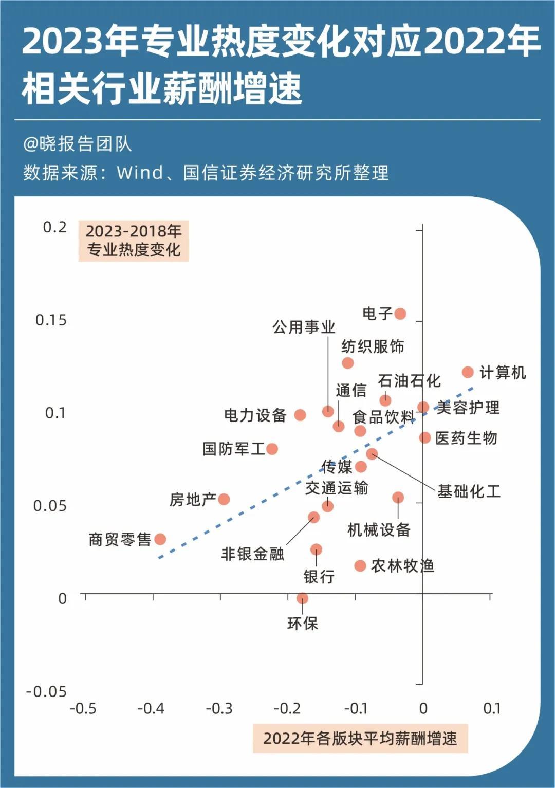以計算機行業爲例,2022年,計算機行業的薪酬增速超過大部分行業的平均水平,傳導到2023年,計算機專業的報考熱度處於明顯的上升區間。