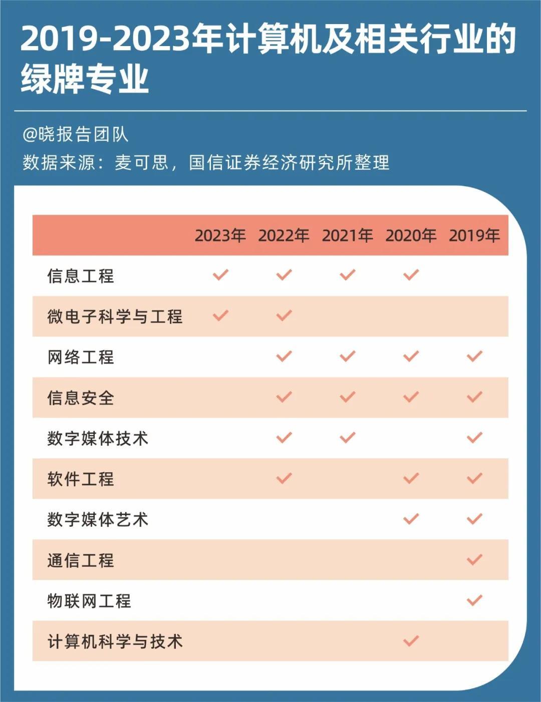 麥可思統計數據顯示,2019—2023年的5年間,即便計算機及相關行業中,依舊存在部分薪資、就業率持續走高的綠牌專業。但相較於2019年,2023年的綠牌專業已經從7個掉到了2個,僅剩下信息工程和微電子科學與工程。