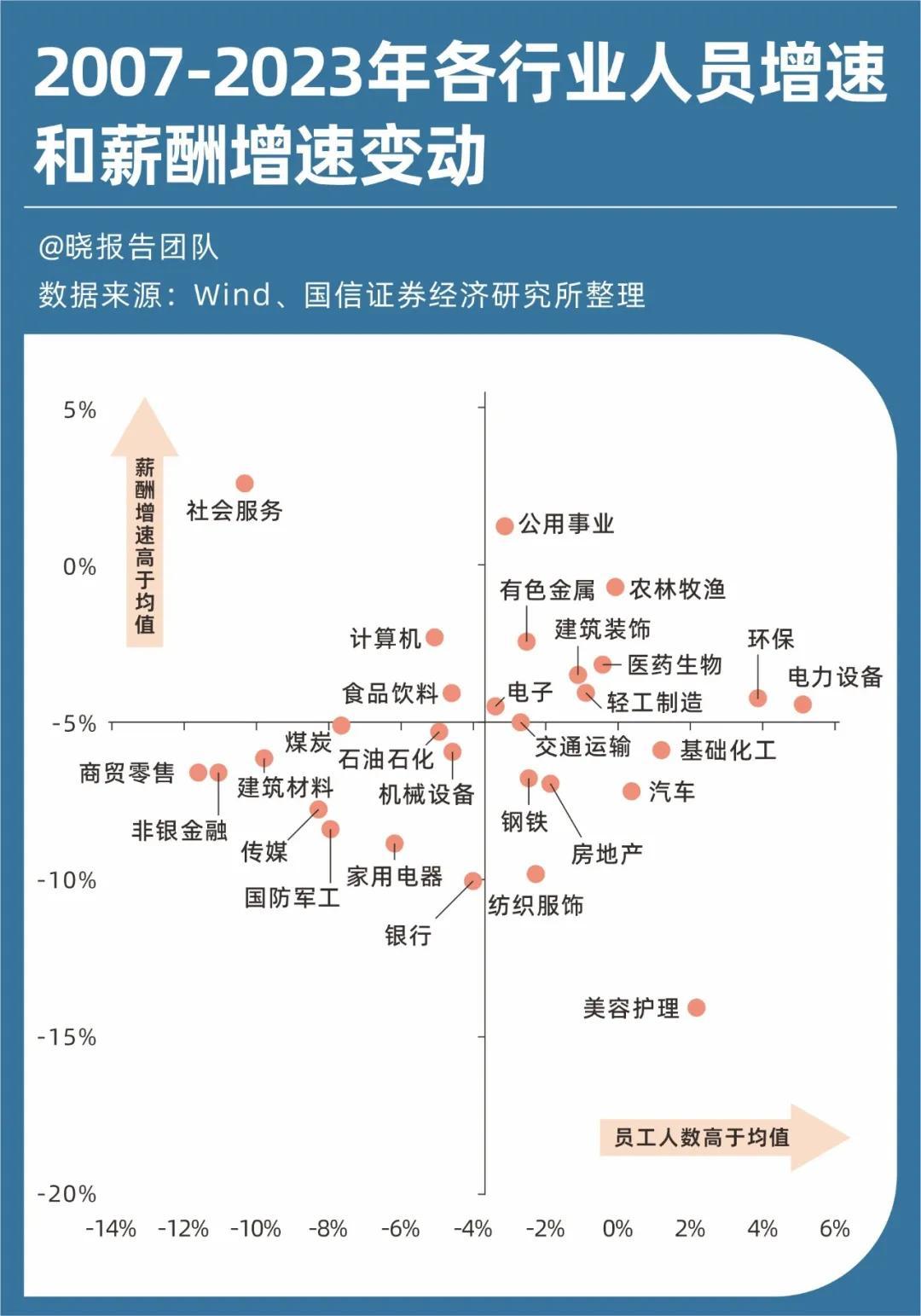 在這張座標系中,第一象限的行業是最值得關注的,比如電力設備、環保、公用事業和有色金屬等行業。在2007—2023年間,處於這一象限的行業不僅從業人員不斷增加,行業規模不斷擴大,薪酬增速也高於平均速度。