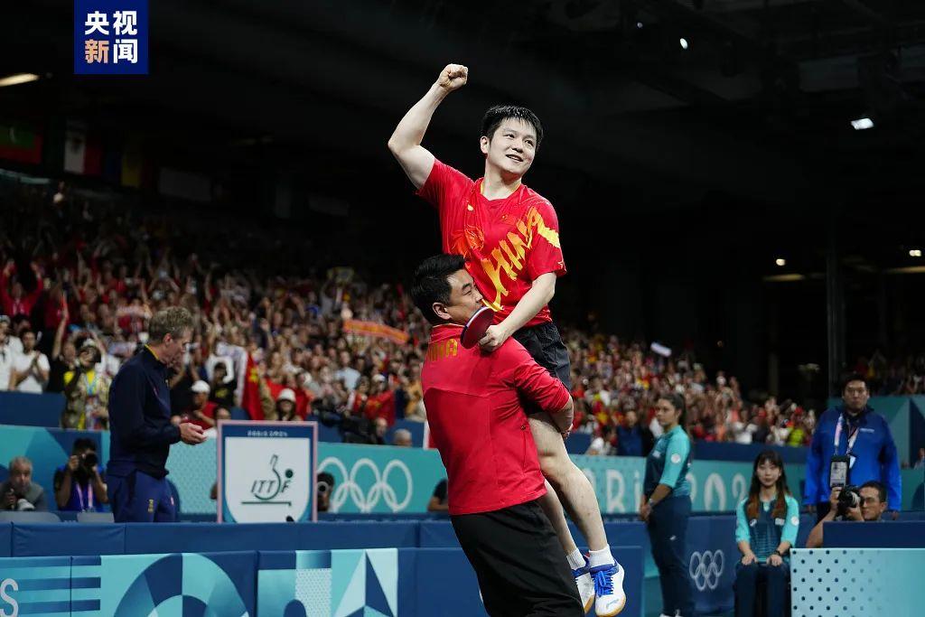 北京時間2024年8月4日,在巴黎奧運會乒乓球男子單打金牌賽中,中國選手樊振東戰勝瑞典選手,奪得金牌。賽後,在場邊的教練王皓將樊振東高高舉起,師徒二人一起享受奪金後的喜悅。