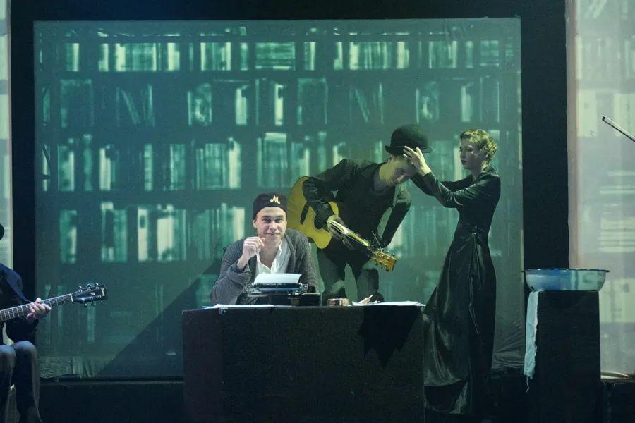 小提琴、低音提琴、長笛和雙吉他組成的五人樂隊是劇中隱形的敘事者,既打破了樂池的界限,又化用了歌隊形式。小提琴與長笛的高音調宛若漂浮在莫斯科上空的幽咽絮語,低音提琴低沉的震顫則暗示着古羅馬猶太總督彼拉多跨越千年的道德重負。樂隊功能變換靈活,現場演奏既可以烘托情境,渲染人物形象,也可以參與旁觀,甚或直接介入情節。如大師在地下室寫作的場景中,打字機的機械節拍與吉他的和絃對位,恰似作家意識中歷史真相與藝術虛構的角力。此時,音樂不只是情緒渲染,更是思維活動的具象化呈現。又如柏遼茲出殯時,低音提琴被橫臥如棺槨般擡出來,樂隊從臺下觀衆席前排邊演奏邊行進,諷刺了柏遼茲潦草可悲的結局。此處,音樂既是敘事載體,亦是間離評判。