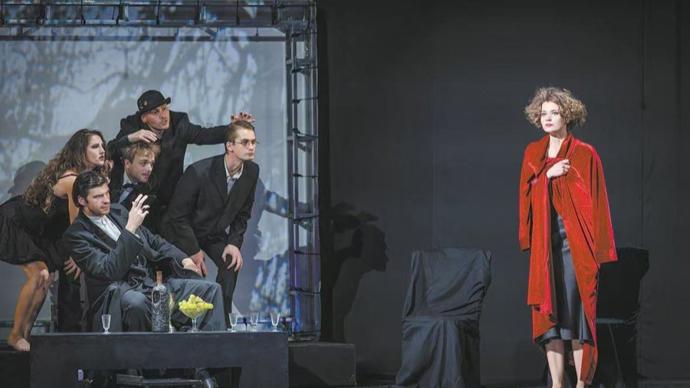 這種返璞歸真的創作姿態,恰是俄羅斯戲劇傳統的體現。斯坦尼斯拉夫斯基的心理現實主義的基因在演員們自我燃燒式的表演中延續:當瑪格麗特身披單薄的白紗,帶着象徵荊棘冠的王冠,袒肩赤足端坐於撒旦舞會的上座時;當沃蘭德從舞臺深處用冷峻的眼神切開第四堵牆時,觀衆看到的不僅是角色塑造,更是演員將靈魂交付給舞臺的儀式。那種似乎被人日漸淡忘的質樸戲劇美學,就在簡單的移動幾何背景板、簡潔的燈光和演員極具表現力的身體意象組合中,重新煥發出迷人的光彩。
