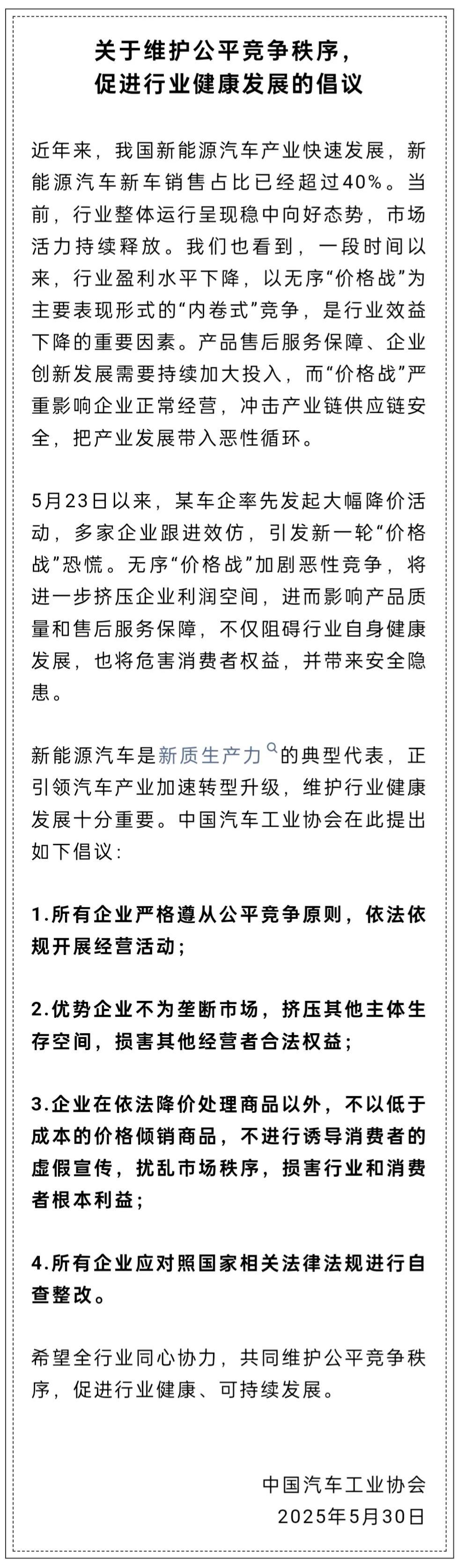 5月31日,中國汽車工業協會發出倡議:所有企業應嚴格遵從公平競爭原則,依法依規開展經營活動;優勢企業不爲壟斷市場,擠壓其他主體生存空間,損害其他經營者合法權益等。工信部隨即表態,贊同並支持中汽協“維護公平競爭秩序,促進行業健康發展的倡議”。