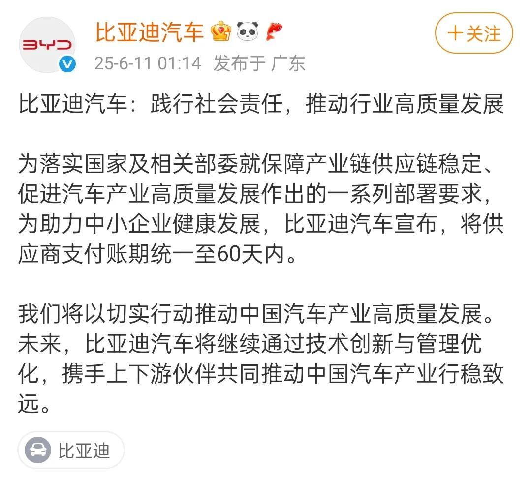 昨日凌晨一點,中國第一大車企比亞迪發文稱,將供應商支付賬期統一至60天內。