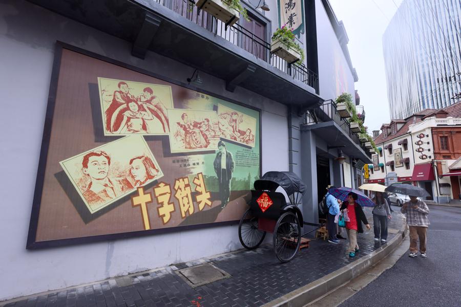 現在,電影場景再造、打卡,是乍浦路最顯見的文旅模式。以勝利電影院爲起點步入乍浦路,重新掛起的《醬園弄》海報第一時間躍入視線。“我們想呈現更好的宣發方式,所以從五一開始調了多次方案,最後按牆體尺寸訂製海報,長9米、寬5米。”當然,營造氛圍並不單純靠幾幅視覺作品,爲豐富影迷市民的體驗,沈斌和團隊保留了電影中的許多道具,融入街區改造。