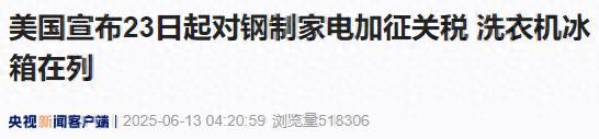 據央視新聞消息,美國商務部宣佈將自6月23日起對多種鋼製家用電器加徵關稅,包括洗碗機、洗衣機和冰箱等“鋼鐵衍生產品”。據悉,對大多數國家設定50%的關稅將影響這些鋼鐵製品的進口,可能導致消費價格上漲,行業利益相關者正在密切關注事態發展。來源丨央視新聞客戶端編輯丨吳澤斌