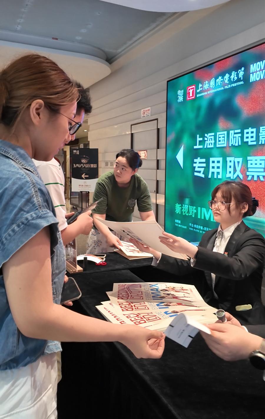 票根推高了觀影儀式感。上影節開幕次日,記者發現午餐時間剛過,在MOViE MOViE影城推出的“影院紀念票根透卡”已全部兌完。好在從專用取票機中取出紙質影票後,領到了工作人員分發的專屬IMAX珍藏紀念海報,大堂以電影節主視覺海報爲背景的互動裝置前打卡拍照的的隊伍也十分熱鬧。“影院爲《成爲齊柏林飛艇》準備了三百多張海報,保證人手都有。”現場兩位工作人員正爲排起長隊的影迷蓋章、分發。“儀式感拉滿”,20歲的陳女士很開心。
