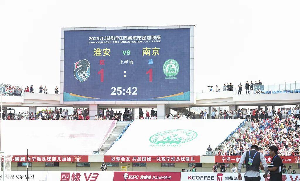慢慢地,出現差異化。二十二分鐘,南京隊藉助角球機會,打進一記頭球。三分鐘後,淮安隊以一記精彩傳控後的頭球,強勢扳平比分。