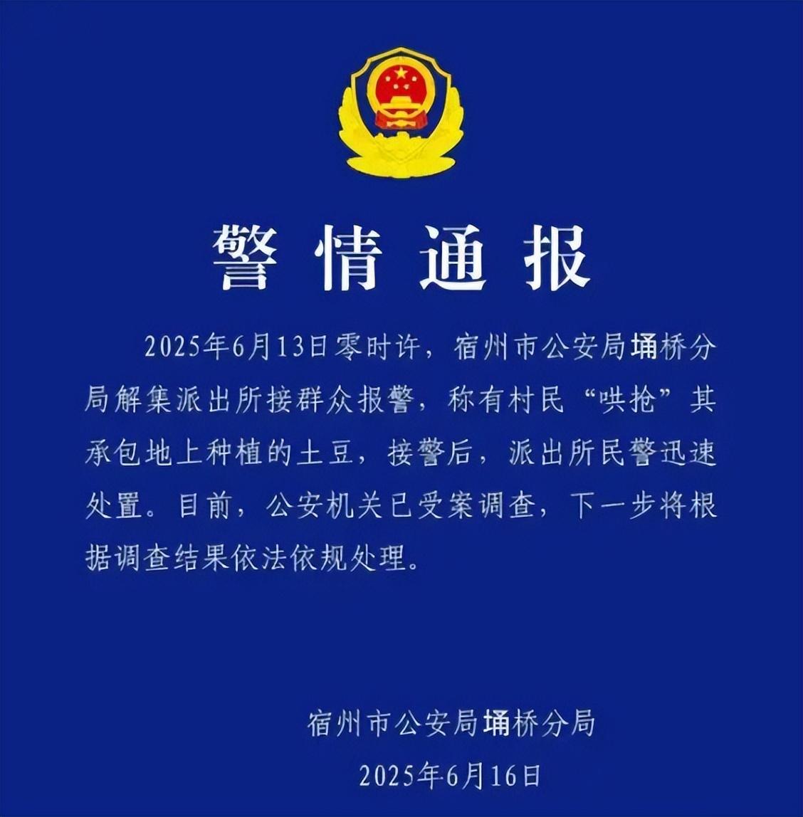 參考信源:《安徽500畝土豆遭村民哄搶預計近100萬斤 警方已立案》紅星新聞2025-06-16 13:09