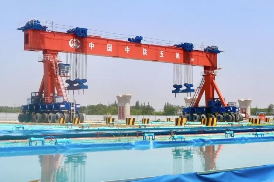 這臺正在吊運的提樑機爲DLT900型輪胎式提樑機,自重約440噸,單臺起重能力達900噸,配備56個大型輪胎,重載時最大走行速度爲每分鐘17米。主要用於預製場內的箱梁起吊、轉移以及向運梁車裝梁等工作。