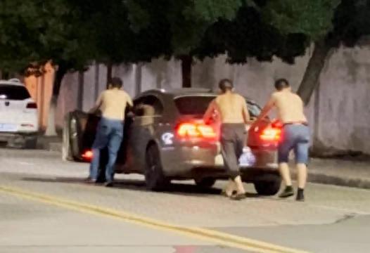 交警支隊高新大隊民警調看沿途監控發現,三位男子推行一輛小型汽車,從鄧城大道輔路右轉至樊魏路,經桃園路路口後,在樊魏路一汽修店附近停下,全程接近500米。