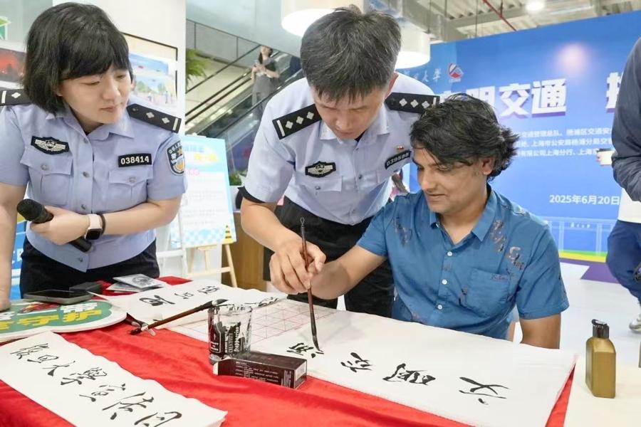活動現場還有一場“文化碰撞”令人眼前一亮。上海市先進工作者、楊浦分局交管支隊機動大隊副大隊長倪嘉輝化身“書法老師”,鋪開宣紙,揮毫潑墨,寫下“一盔一帶,安全常在”等交通安全標語。外國留學生們被這神奇的東方藝術深深吸引,倪警官手把手教他們執筆、運筆,在一筆一畫間感受書法魅力,同時巧妙地宣傳了“一盔一帶”及校園周邊易致禍易致亂的違法行爲,讓國際友人也成爲文明交通的踐行者。