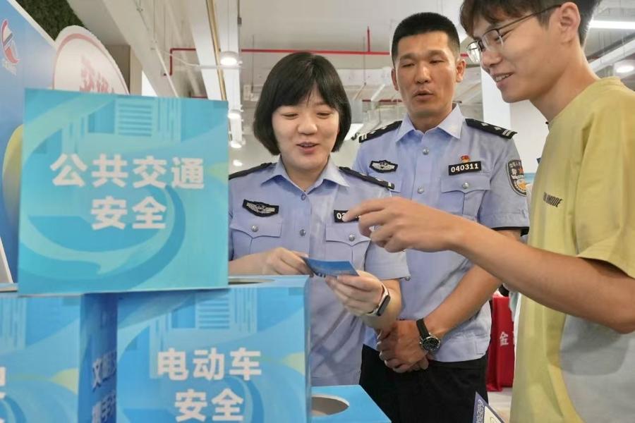 最受歡迎的當屬交通知識競答大轉盤。轉盤飛轉間,“交通達人”們摩拳擦掌。“電動自行車載人有什麼規定?”“遇到交通事故該怎麼處理?”一道道問題拋出,學生們自信滿滿地搶答,答對的幸運兒滿心歡喜領走交通宣傳徽章、精美香囊等文創小禮物。一旁的交通宣傳背景牆前,更是排起長隊,學生們爭相拍照打卡,將文明出行的理念“曬”到朋友圈,化身交通安全的“移動宣傳員”。