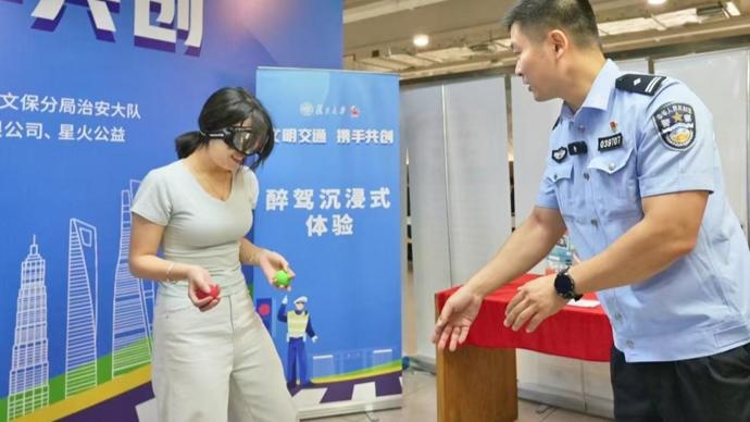 在沉浸式體驗區,現場變身“交通安全實驗室”。戴上醉駕模擬眼鏡,原本簡單的拋球、走直線動作,變得比“登天還難”。不少學生戴上眼鏡後,東倒西歪,連站立都變得困難,引得周圍陣陣笑聲,同時也切身感受到酒駕帶來的眩暈與危險。