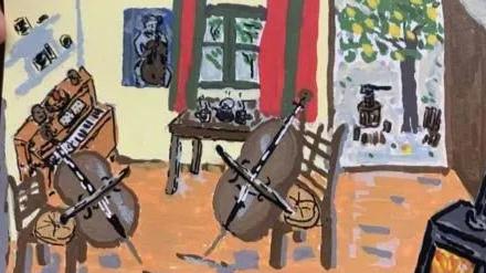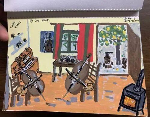 老師正在家裏練琴(下圖爲老師家的琴房,作者手繪),看我來了,又驚又喜,沒想到停網停電停車的情況下,我還能堅持來上課。他看了看手錶,笑着放下琴:“天意如此,今天不適合上課。走!我帶你去本地人常去的酒吧喫點好的,見見鄰居們,然後再帶你去我常去的山頭散散步!我給你把客房準備好,不嫌棄的話,今晚就住我家吧,明早我們再上課。”