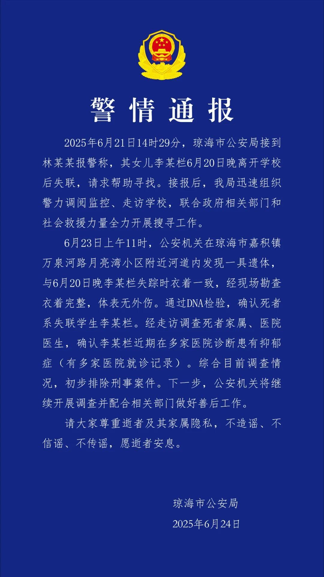 其中提到,“6月23日上午11時,公安機關在瓊海市嘉積鎮萬泉河路月亮灣小區附近河道內發現一具遺體,與6月20日晚李某欄失蹤時衣着一致,經現場勘查衣着完整,體表無外傷。通過DNA檢驗,確認死者系失聯學生李某欄。經走訪調查死者家屬、醫院醫生,確認李某欄近期在多家醫院診斷患有抑鬱症(有多家醫院就診記錄)。綜合目前調查情況,初步排除刑事案件。下一步,公安機關將繼續開展調查並配合相關部門做好善後工作。”