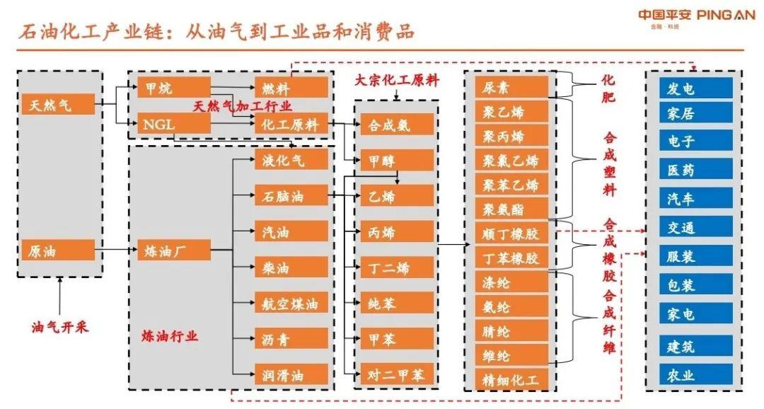 值得一提的是化工原料,包括乙烯、丙烯、丁二烯、甲苯等,再變成滌綸、聚乙烯、聚苯乙烯、腈綸等合成爲各類塑料、纖維、橡膠,用於家居、電子、醫藥、服裝、家電、建築等涵蓋日常方方面面的工業製品。