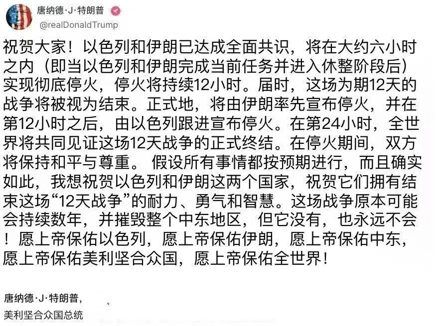 結果,美國總統特朗普在“真實社交”平臺發文:以色列和伊朗已同意全面停火。伊朗官員一名官員卻表示“這是美國挑釁伊朗的伎倆”。
