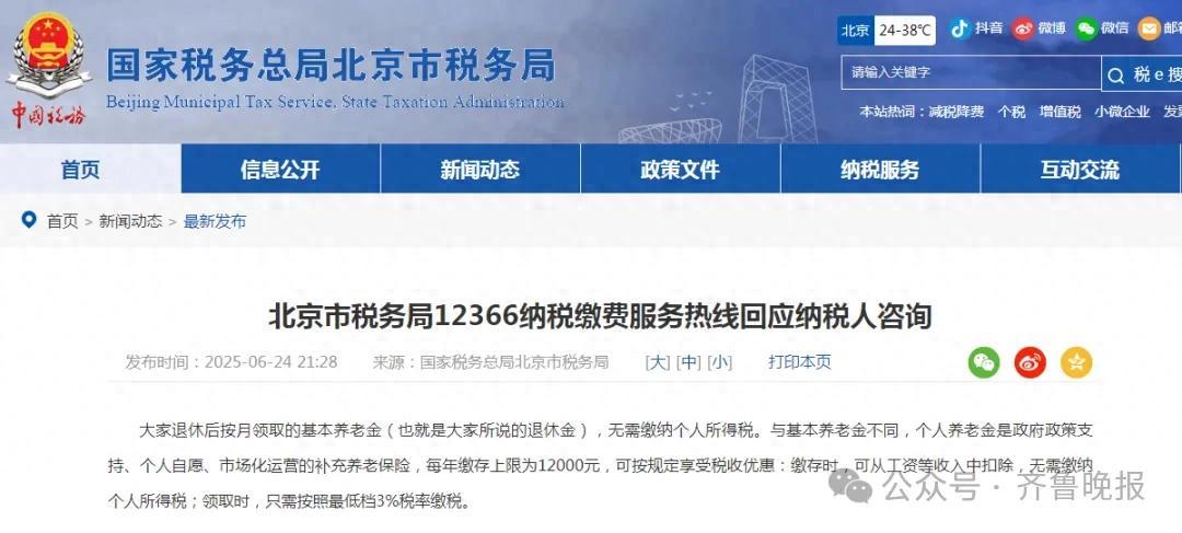 “個人養老金領取時,按照領取額的3%繳納個人所得稅”並非一項新的要求。早在2024年12月13日,財政部、國家稅務總局就聯合發佈《關於在全國範圍實施個人養老金個人所得稅優惠政策的公告》明確提出,在領取環節,個人領取的個人養老金不併入綜合所得,單獨按照3%的稅率計算繳納個人所得稅,其繳納的稅款計入“工資、薪金所得”項目。