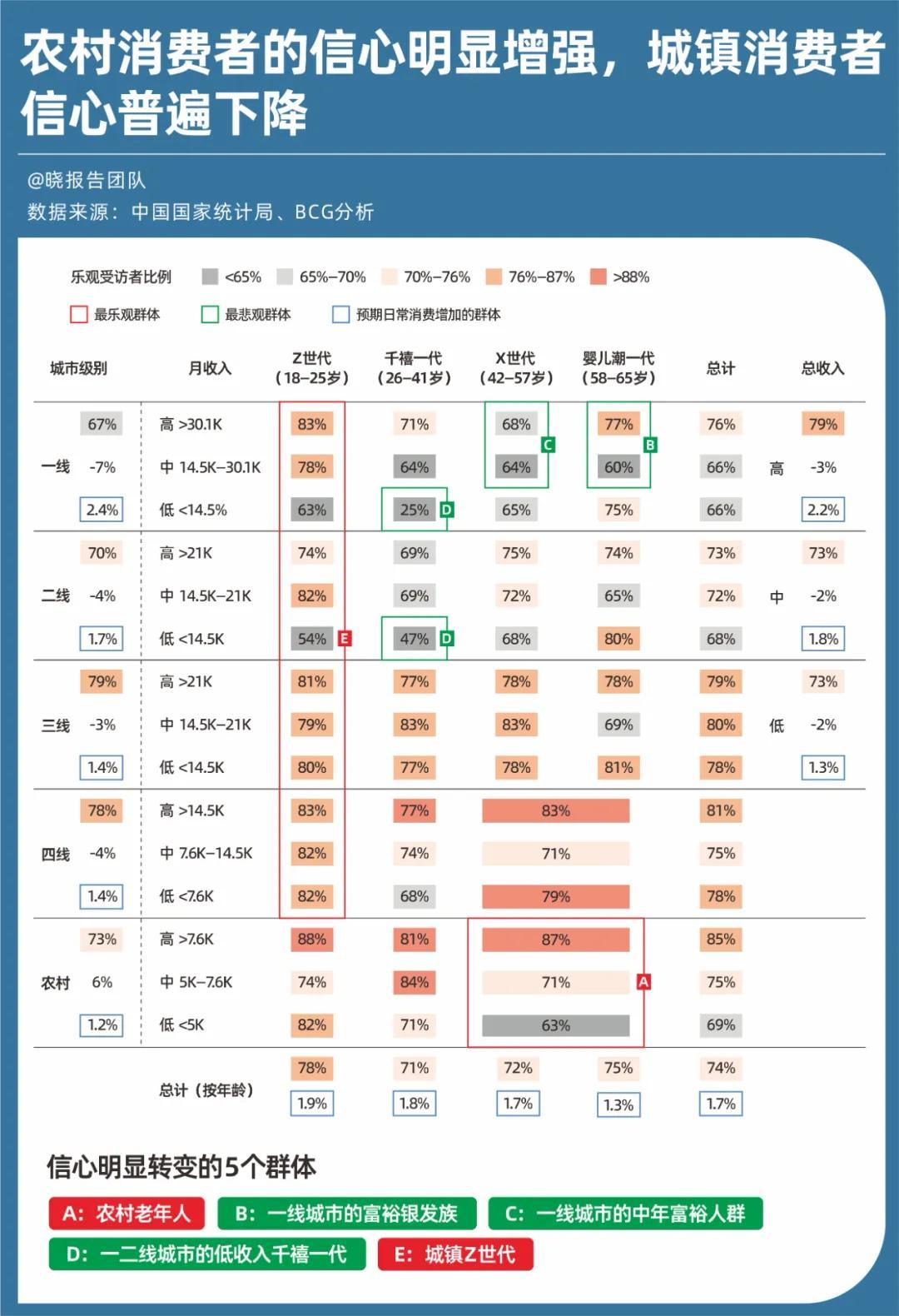 ◎ 城鎮富裕老年人,曾經最樂觀的羣體,如今消費信心下滑。由於資產貶值和企業表現不佳等因素,一線城市的富裕銀髮族(嬰兒潮一代,58—65歲),消費信心下降了約20%。