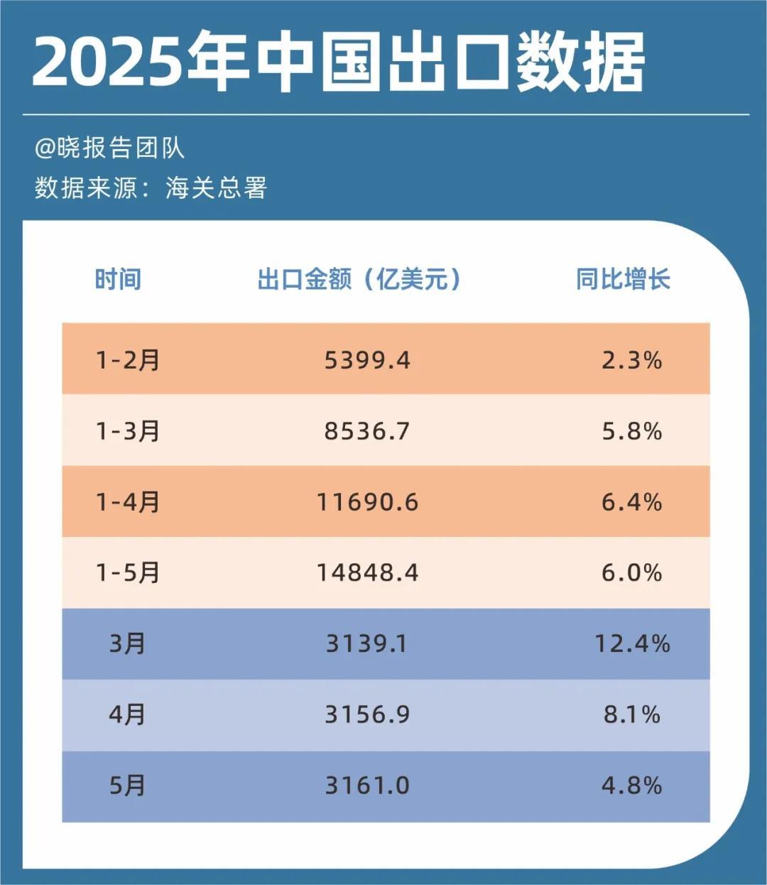 據海關統計數據,1—5月我國出口14848.48億美元,同比增長6%。其中,3月和4月的數據更能讓我們感受到出口的“激情衝刺”,出口金額分別同比增長分別爲12.4%和8.1%,顯著好於市場預期。