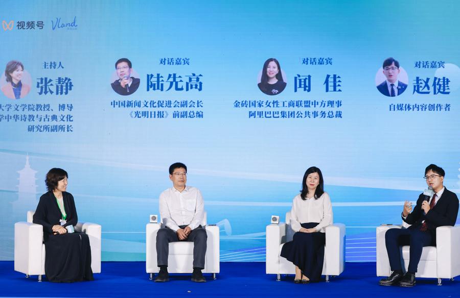 活動特設的 “知音杭州 雙芯對談” 交流環節亮點十足。中國新聞文化促進會副會長、《光明日報》原副總編陸先高,金磚國家女性工商聯盟中方理事、阿里巴巴集團公共事務總裁聞佳,知名知識博主、自媒體內容創作者趙健展開對談。嘉賓們圍繞數字時代如何激活古典詩詞生命力、科技企業如何助力文化傳承、新媒體在普及詩教中的獨特作用等議題,暢所欲言,思想火花不斷碰撞。活動尾聲,主持人與特別嘉賓 “騰訊元寶” 互動。“騰訊元寶” 展示了 AI 如何爲古典詩詞注入新活力,用戶一句簡單指令,詩詞就能成爲表達祝福的生動方式,還能逐句解析古詩中的典故、意象、用詞,充分展現現代科技在詩詞文化傳播中的獨特價值。