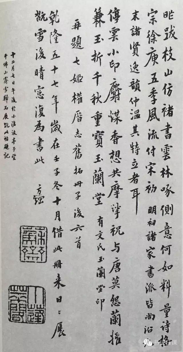 前面說到宋克的《七姬志》僅有拓片留存,極受後人重視。到了清朝,有藏家將兩個版本合爲一冊,乾隆年間,被翁方綱借去,老翁太愛這幾張小拓片了,在後面跋了又跋——