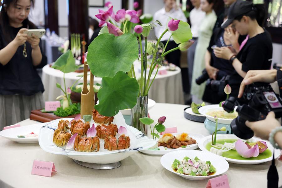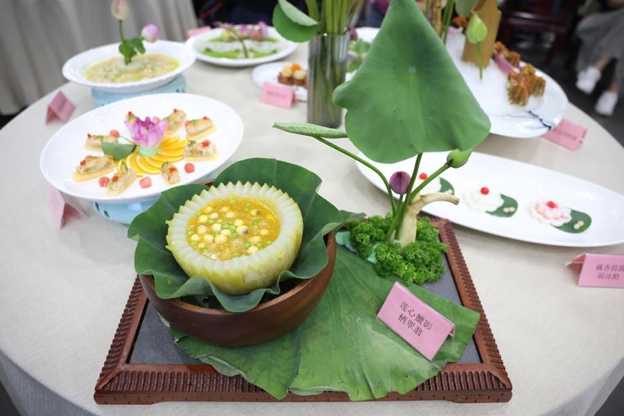 6月26日,“荷香盛宴 荷你共享”中式烹飪技能競賽在古猗園餐廳熱鬧上演。來自上海古猗園餐廳、豐德園、封記老飯店、松茗苑等多家餐廳的大廚們,圍繞荷蓮主題各顯神通,精心烹製了29道創意菜品和點心。從嬌豔的荷花花瓣,到清甜的蓮子、脆嫩的藕帶,每一種荷蓮及衍生材料都被巧妙融入各類優質食材中,化作一道道色香味俱全的佳餚。