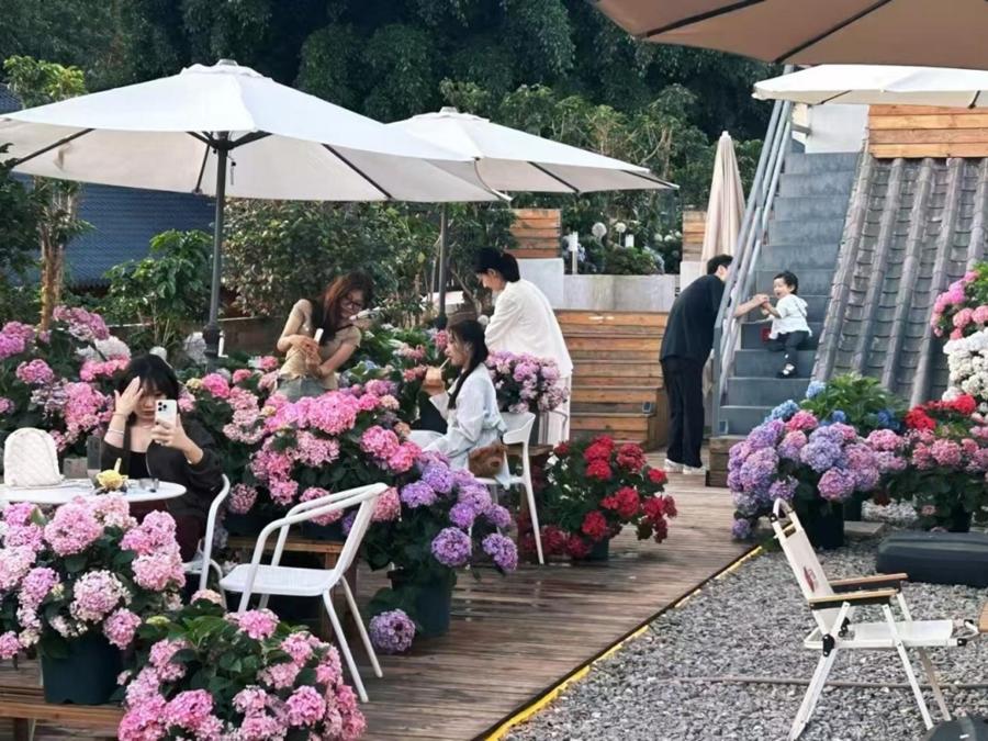 除了別具一格的飛碟茶咖,普洱還推出了花海茶咖、草坪茶咖、湖畔茶咖等特色體驗。在思茅區思亭路與茶城大道交叉口的子元貓咖啡館露臺,精心打造的“花海”成了網紅打卡地。屋頂旁、遮陽傘下、座椅周圍,各色繡球花競相綻放。遊客們或在此愜意品咖,或拍照留念。門店工作人員透露,每逢週末,露臺總是座無虛席,若提前預約,還能享受花語主題的桌面佈置服務。