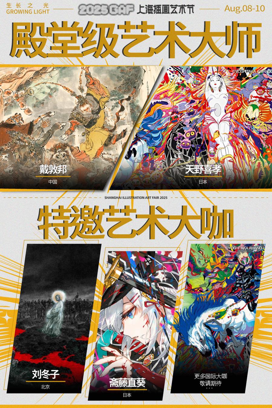 本屆插畫藝術節以“生長之光”爲主題,呈現七大主題展區及20餘場活動,將爲上海乃至全國的藝術愛好者打開一扇瞭望全球藝術潮流的窗口。其中,最大亮點當屬兩位藝術大師特展——日本藝術巨匠天野喜孝、中國畫家戴敦邦將赴現場交流,爲盛夏申城注入藝術活力與想象力。