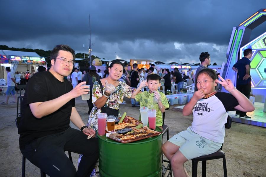 遊客們穿梭其中,沉浸在麥芽香氣與鹹澀海風之間,享受微醺又愜意的海濱夏夜。啤酒愛好者徐先生特意邀請了市區的朋友一同前來,他難掩興奮地說:“我去過不少啤酒節,這次聽說了沙灘音樂啤酒節的消息,專門約了朋友過來。吹着海風、喝着啤酒、聽着音樂,特別愜意。”據介紹,景區開放時間爲8:30至21:30,白天有豐富多彩的活動供遊客參與,而啤酒節區域從17:30起直至21:15結束,讓遊客在白天盡享沙灘樂趣後,傍晚繼續投身啤酒節的狂歡。美食盛宴匯聚 奏響融合發展新樂章 除了香醇的啤酒,現場還有繽紛多樣的美食。