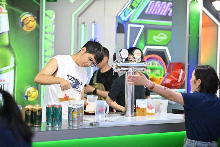 佔地1萬多平方米的區域被精心劃分成舞臺區、啤酒展區、集市區、遊藝區和座位區等五大功能區。其中,啤酒展區佔地約100平方米,分爲品牌啤酒、0度啤酒和精釀啤酒三大區域,匯聚了青島啤酒等知名品牌,還有朝日、芸釀、厚浪等精釀啤酒以及低度雞尾酒調酒,全方位滿足不同遊客的口味需求。