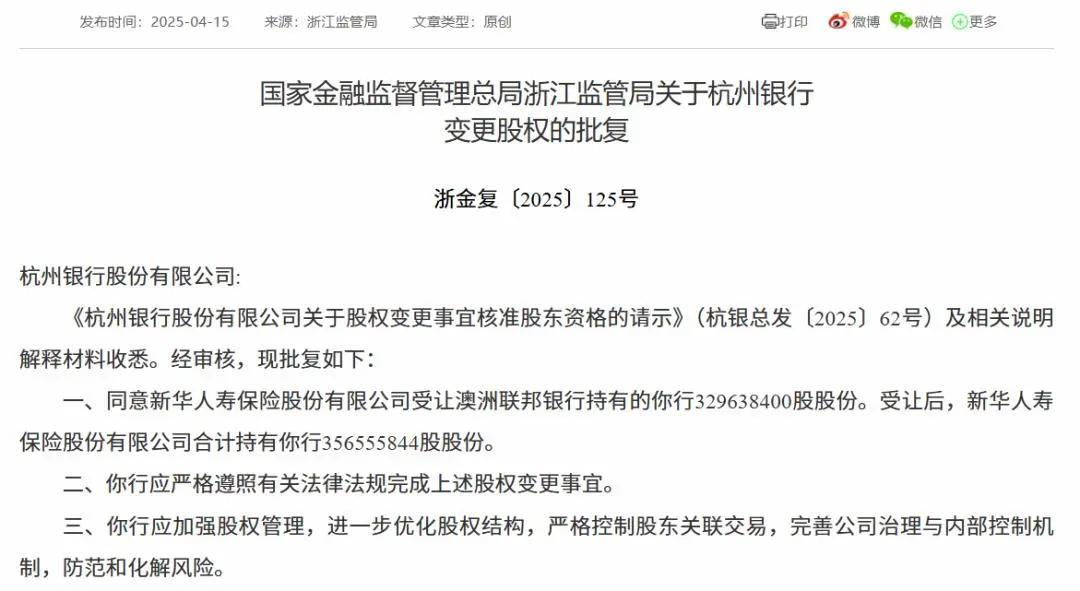 截至目前,2025年已經有5家銀行被被險資增持並超過“5%舉牌線”。比如新華保險於今年年初買入杭州銀行,持股比例5.45%觸發舉牌。