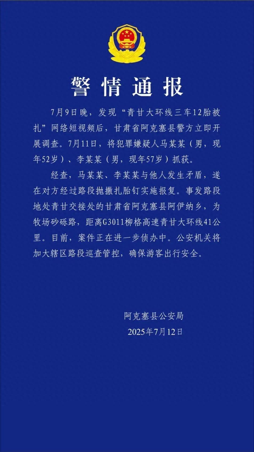 經查,馬某某、李某某與他人發生矛盾,遂在對方經過路段拋撒扎胎釘實施報復。事發路段地處青甘交接處的甘肅省阿克塞縣阿伊納鄉,爲牧場砂礫路,距離G3011柳格高速青甘大環線41公里。目前,案件正在進一步偵辦中。公安機關將加大轄區路段巡查管控,確保遊客出行安全。