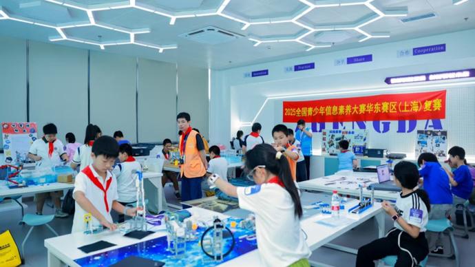 記者瞭解到,本次複賽採用線上與線下相結合的方式進行,其中線下複賽於7月12日舉行,線上複賽則安排在7月19日和20日,從複賽中勝出的選手,將代表華東賽區(上海)參加於今年8月在浙江省桐鄉市烏鎮舉行的全國總決賽。其中,線下賽涵蓋創意工程主題賽、智創生態挑戰賽等多個項目,線上賽包含 Python 編程挑戰賽、圖形化編程挑戰賽等。創意工程主題賽中,選手們巧妙運用各種材料,搭建出富有創意的作品;智能運輸器開源主題賽裏,他們操控着自己設計的運輸器,完成各項任務,展現出較強的實踐能力和創新思維。