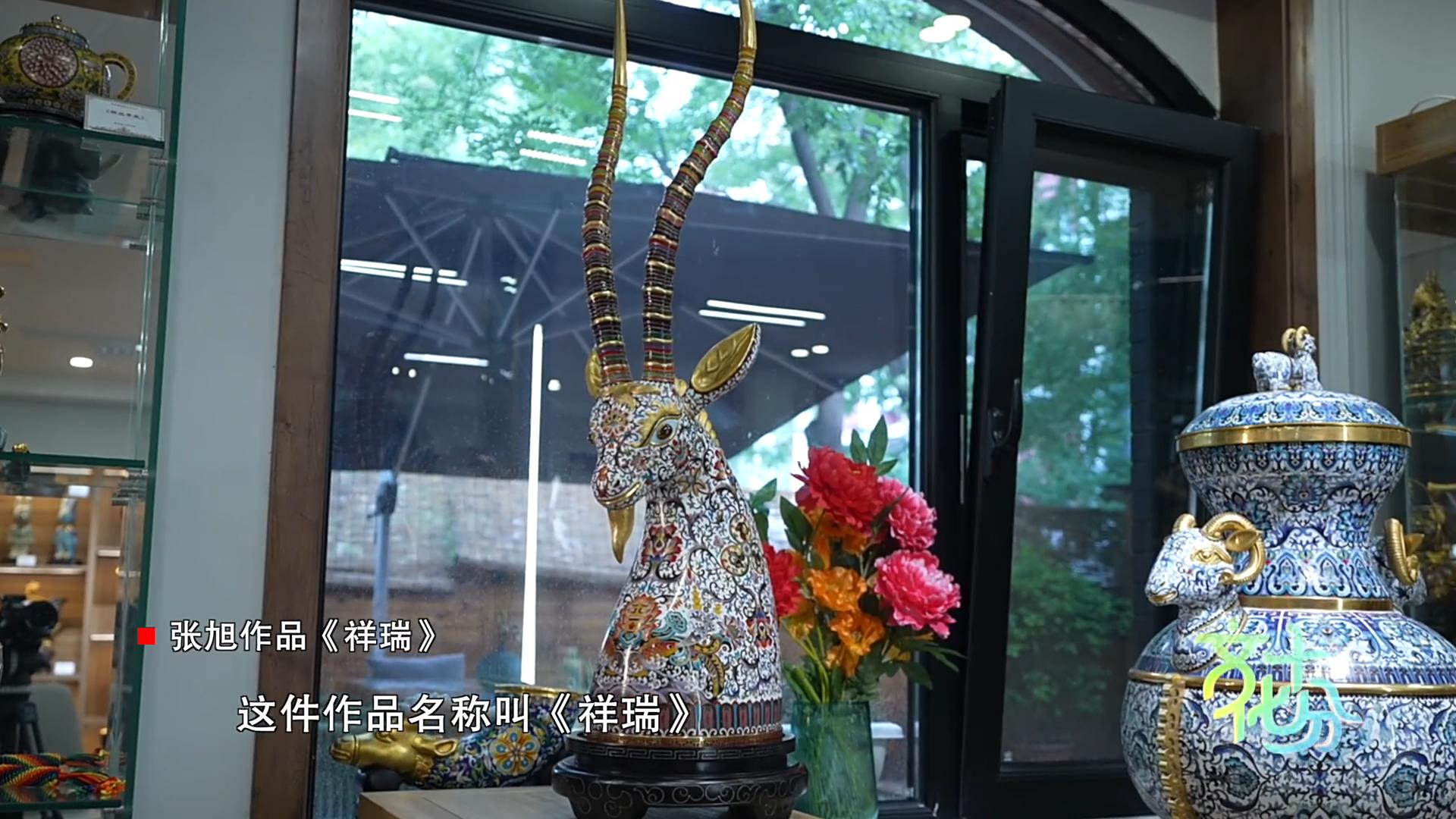 張旭:這件作品名稱叫《祥瑞》,我在創作上也很多的時候會考慮用現代這種雕塑藝術體現景泰藍的造型。其實藏羚羊的羚羊角很短,我在創作時候做成了一個誇張的處理,讓它有一個向上伸展,積極向上、健康茁壯成長的寓意。