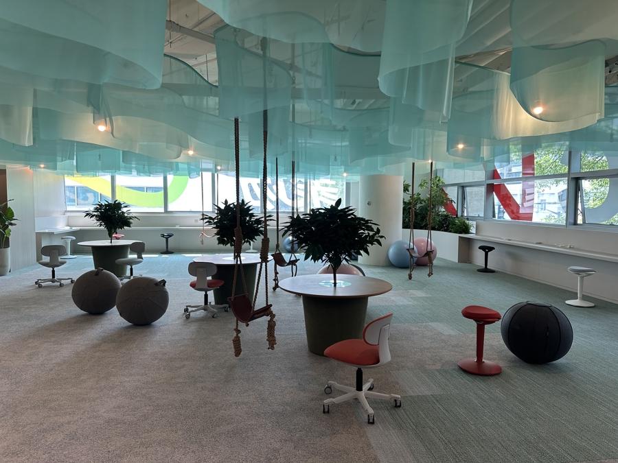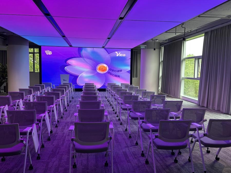 顧名思義,“V”代表着全國甚至全球的在線文娛產業從業者。V聚場是一棟高三層、立體設計的大樓,位於創智天地6號樓。記者初探發現,其中打造有多個特色場景,集辦公、培訓、直播等功能於一體,配置專業攝影棚、配音室、特效製作中心等共享設施。