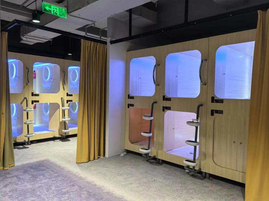 二樓一處空間佈設了12個膠囊睡眠艙,爲未來入駐的內容創作者提供小憩之地。屋頂,LED燈勾勒出“sleep no more”字樣,這句話出自莎士比亞名作《麥克白》,如今,以沉浸式戲劇“不眠之夜”聞名。僅這兩處設計,就讓人想象出空間內熱火朝天的樣子。