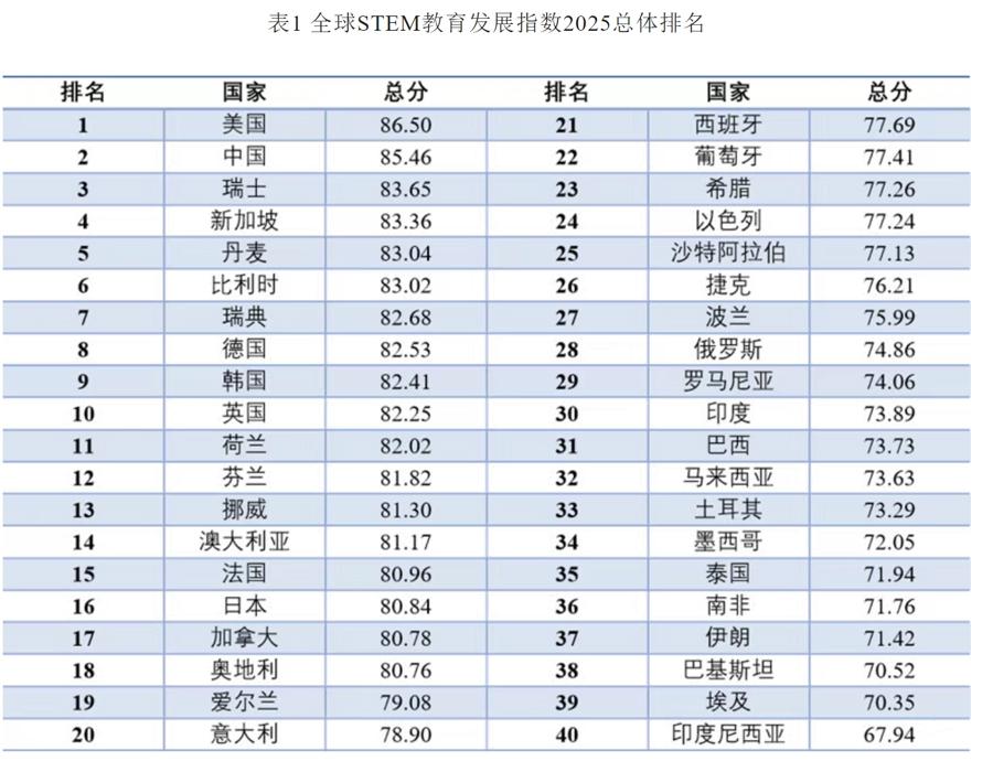 今天(7月13日),同濟大學STEM(科學、技術、工程、數學)教育智庫發佈全球首個國家與地區STEM教育發展綜合評估工具——全球STEM教育發展指數2025(以下簡稱“指數”)。結果顯示,美國、中國、瑞士、新加坡、丹麥等國位居前列。