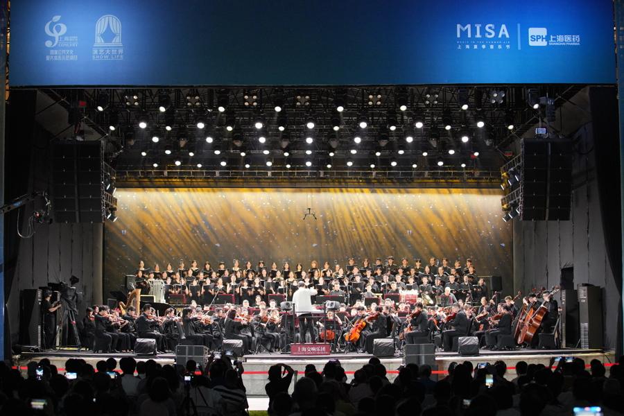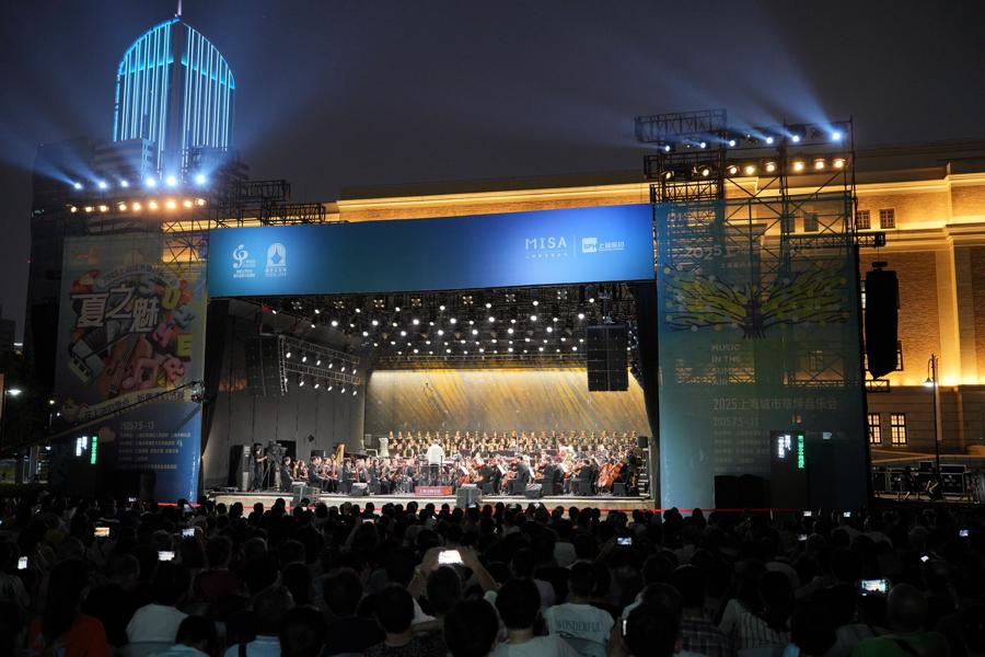 7月13日晚,上海城市草坪音樂廣場上空迴盪着激昂的《義勇軍進行曲》。在音樂總監餘隆執棒下,上海交響樂團攜手回聲節日合唱團,以一場紀念中國人民抗日戰爭暨世界反法西斯戰爭勝利80週年的特別音樂會,爲2025上海夏季音樂節(以下簡稱MISA)畫上句點。這也標誌2025上海城市草坪音樂會“夏之魅”系列活動暨上海夏季音樂節黃浦系列圓滿收官。