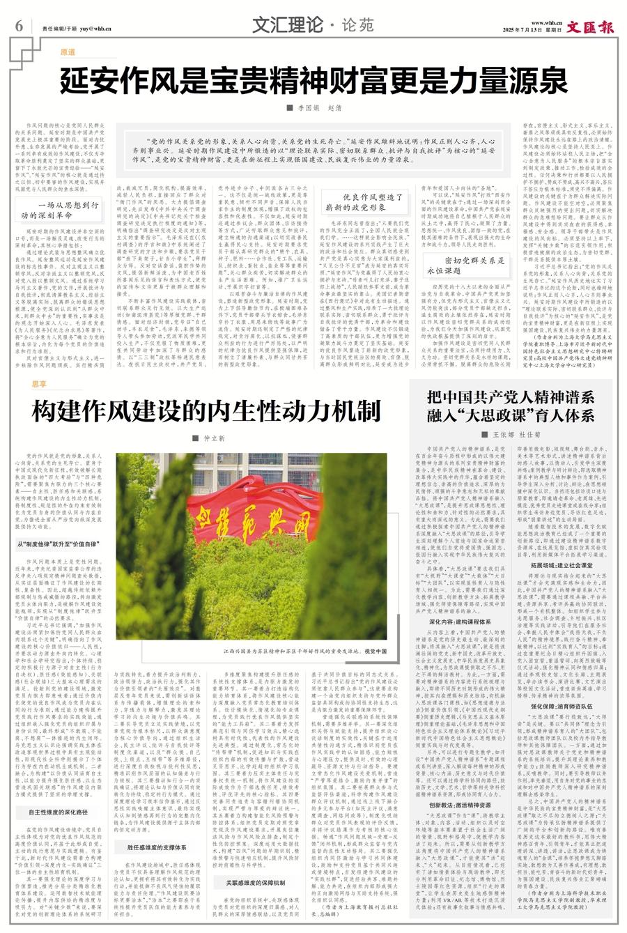 習近平總書記指出:“黨的作風關係黨的形象,關係人心向背,關係黨的生死存亡。”延安作風歷史地證實了習近平總書記的這個論斷,同時也雄辯地說明:作風正則人心齊,人心齊則事業興。延安時期作風建設中所鍛造的以“理論聯繫實際、密切聯繫羣衆、批評與自我批評”爲核心的“延安作風”,是黨的寶貴精神財富,更是在新徵程上實現強國建設、民族復興偉業的力量源泉。