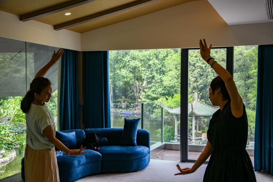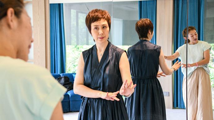 正跟着史依弘學戲的天津京劇院刀馬旦演員程萌昨天才坐高鐵來到上海。她說,剛邁進基地,便被這裏的環境吸引住了,“拍了好多照片”。她感到,這裏的環境與一般的排練場最大的不同,在於有實景、有客流,讓她更能通過自然與社會加強對人、物的理解和塑造,最終呈現出更能與觀衆共情的舞臺表現。就拿她練習的京劇《火鳳凰》來說,史依弘指出她在身形表現上的不足,此時窗外正有一隻白鷺翩然而至,飛停在湖中石上,“我一下子就理解了自己的問題所在”。
