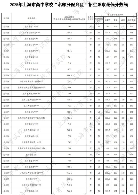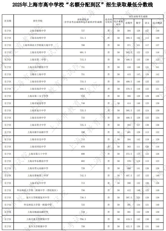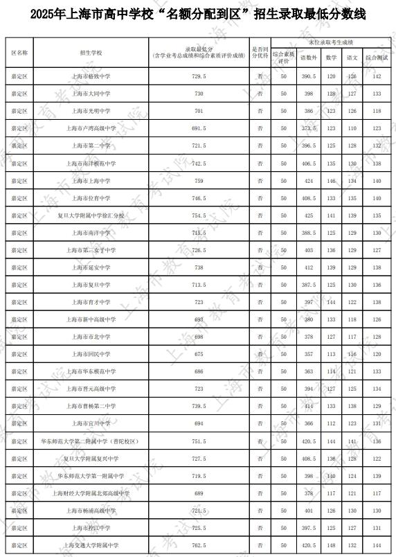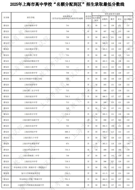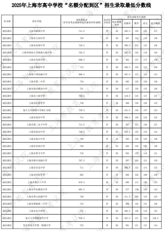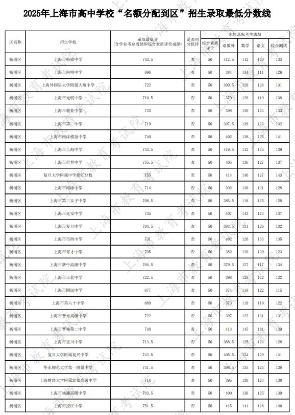 今天,上海市教育考試院公佈了2025年本市高中學校“名額分配到區”“名額分配到校”招生錄取最低分數線進行公佈。名額分配到區分數線如下,名額分配到校分數線可點擊如下鏈接查詢。