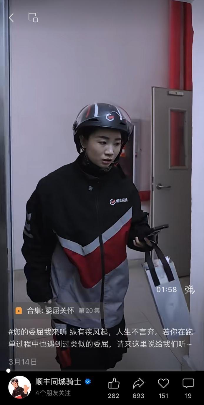 同時,順豐同城也是即時配送行業中首創騎士委屈關懷機制的平臺。早在 2024年4月,該平臺就設立騎士委屈關懷獎,用以關懷在配送中受委屈的騎手;同年7月,又成立 “騎士委屈關懷專項基金”,規模達500萬元,可爲受委屈的騎手提供最高 5000元的關懷金,保障其身心健康。在此次短劇發佈前,“順豐同城騎士” 視頻號已推出一系列相關短視頻,疏導和安撫騎手在配送中產生的各類委屈情緒。